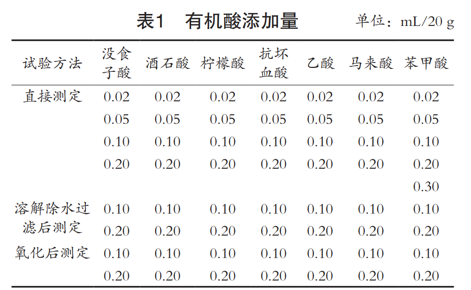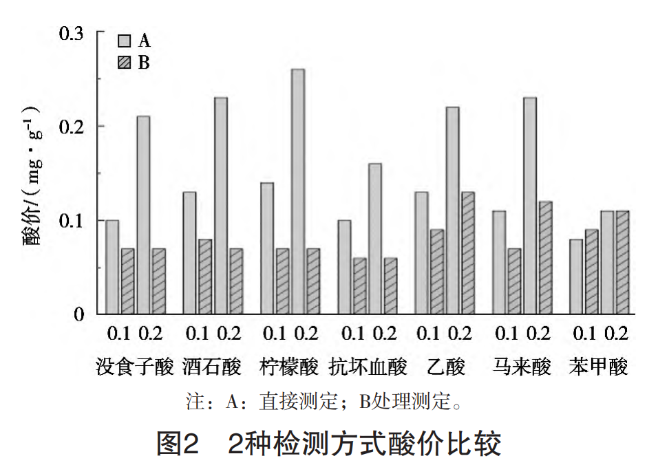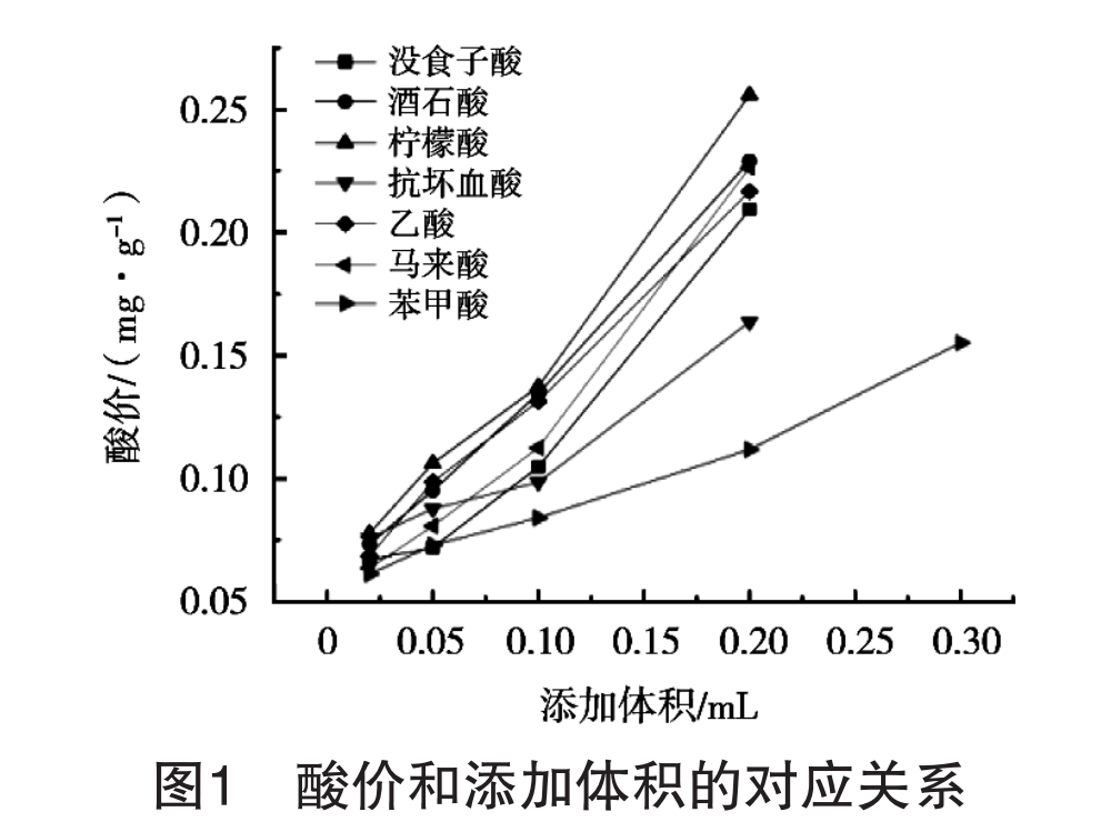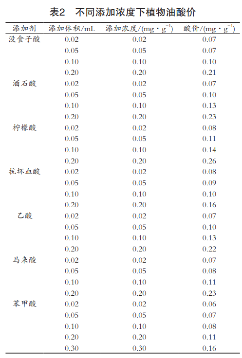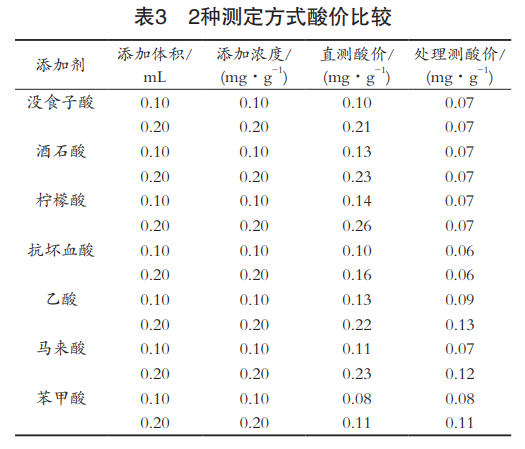 他們的研究結果表明, 直接測定時添加量對酸價的影響呈線性增大, 通過石油醚溶解、無水硫酸鈉除水、去除溶劑后測定的酸價最終反映的是體系中脂溶性有機酸的量。氧化試驗表明沒食子酸、酒石酸、檸檬酸、抗壞血酸等有機酸可使油脂的酸價變化減緩。