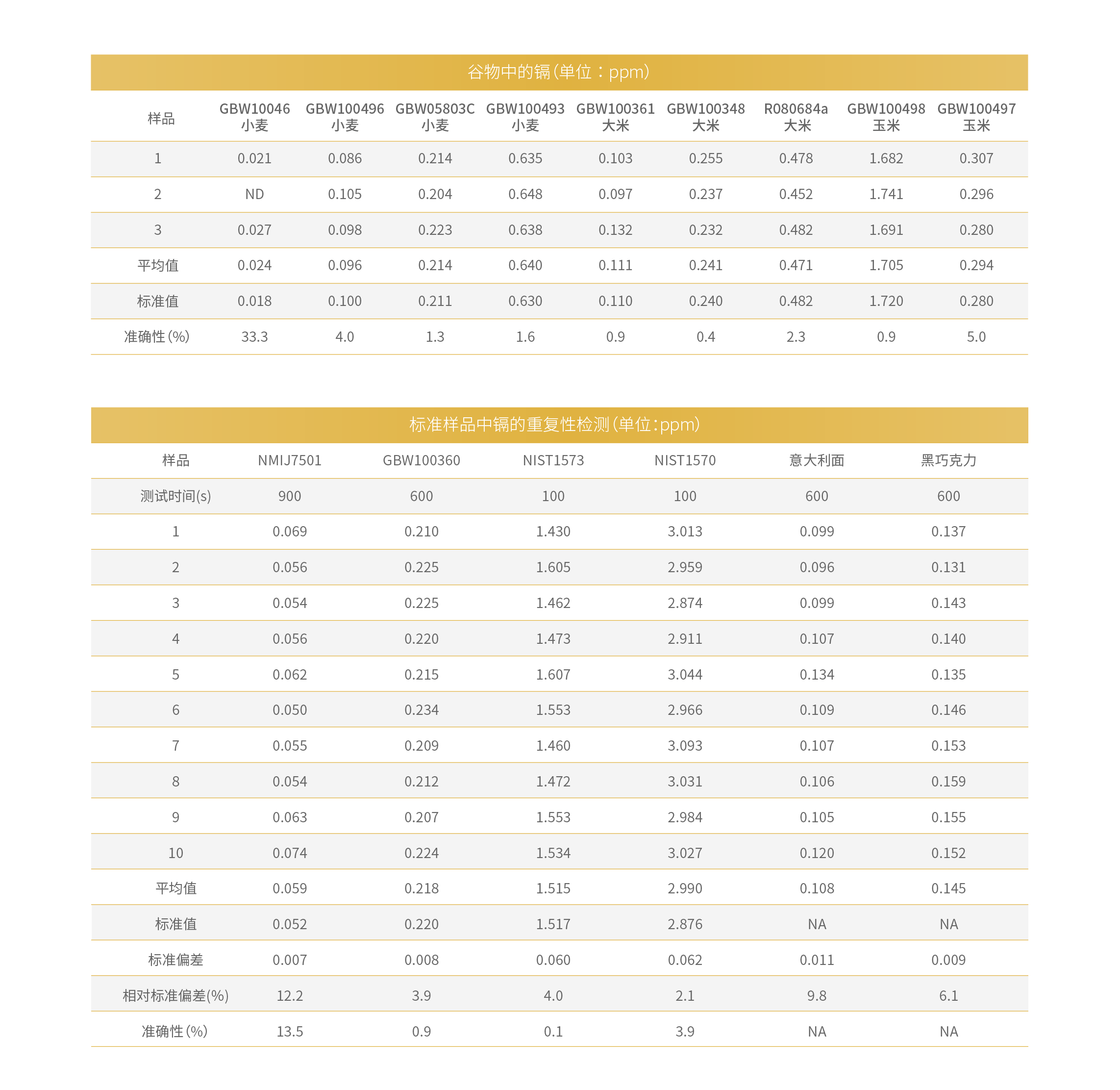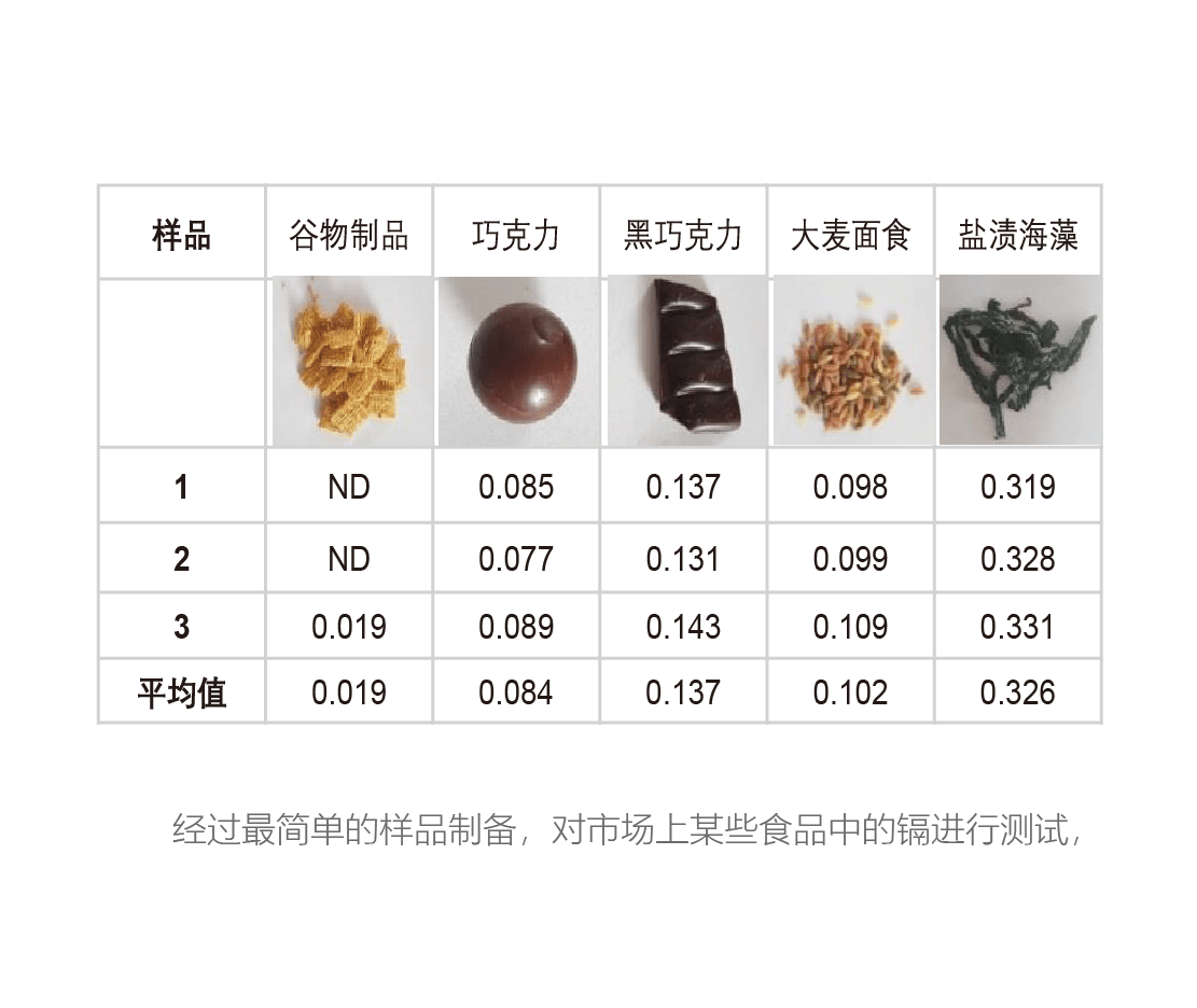 JP500對各類谷物進行檢測以及對農作物及食品標準物質中的鎘進行多次重復測量結果,測試結果具有很高的準確性和重復性和驗證方法的穩定性。