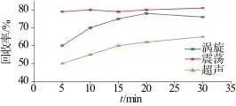 比較超聲提取法、渦旋提取法和全自動垂直振蕩儀提取法對質控樣中地西泮提取的提取回收率,提取時間分別為5、10、15、20、30 min。按照2.1樣品處理的方法進行樣品提取回收率試驗。圖2為三種不同提取方式的魚肉粉中地西泮回收率,從圖2可以看出,超聲法提取效率較低,可能是塑料離心管阻礙了超聲波的傳遞,渦旋法提取效率次之,全自動垂直振蕩提取法效率最高。綜合以上,選擇全自動垂直振蕩提取法,以實現批量操作,省時省力,操作簡單。