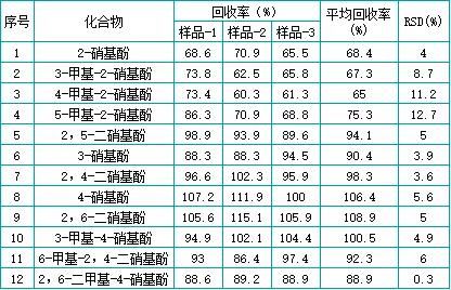 為了驗證該方法的回收率,本實驗向純水樣品(1000 mL)加入硝基酚標準品進行加標回收驗證(n=3),數據如表-2所示。加標回收率在65%-109%之間,RSD值控制在13%以內。說明該方法能夠很好地運用于水中硝基酚類化合物的檢測。