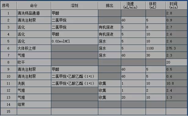 依次用8 mL二氯甲烷,10 mL甲醇和10 mL濃度為0.02 mol/L的稀鹽酸溶液對固相萃取柱進行活化,活化速度為5 mL/min。之后讓水樣以5 mL/min的流速通過固相萃取柱富集,上樣完畢后用氮氣以30 psi的壓力將柱子吹干20分鐘。用10 mL乙酸乙酯-二氯甲烷(1+1)混合溶液洗脫固相萃取柱,流速為1 mL/min。收集全部洗脫液于玻璃試管中,具體方法如下圖所示。