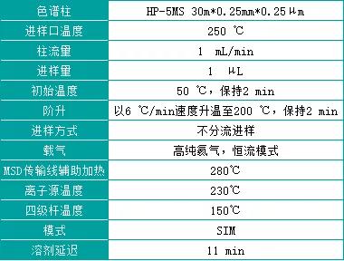 GC-MS檢測條件:進樣口溫度250 ℃,不分流進樣,進樣量1.0 μL;載氣為高純氦氣,恒流模式;電子轟擊電離源(EI),離子源溫度230 ℃,接口(傳輸線)溫度280 ℃,質量分析器溫度150 ℃,溶劑延遲時間11 min。采用SIM模式進行定性分析,選擇離子見表-1。