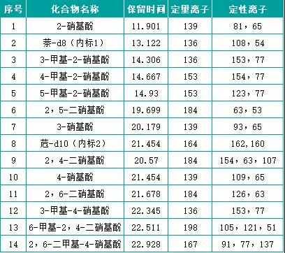 4. 由于硝基酚類化合物極性較大,在氣相色譜/質譜上的響應不是很靈敏,且分析靈敏度對儀器分析體系受污染狀況較為敏感。因此在上機分析時建議使用不填玻璃棉的襯管,否則2,4-二硝基酚、2,5-二硝基酚和2,6-二硝基酚這三個化合物極有可能不出峰。