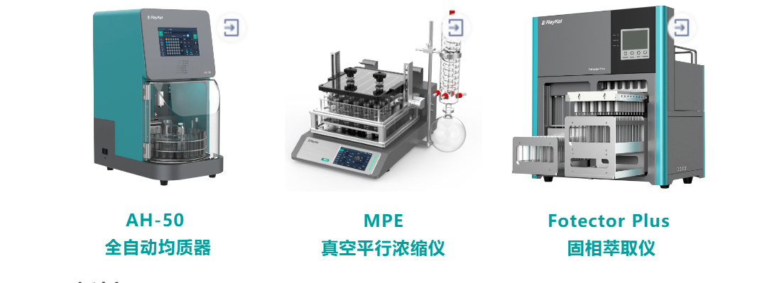 本方法采用睿科AH-50全自動均質器進行批量提取,提取液經MPE高通量真空平行濃縮儀進行濃縮,然后用Fotector Plus高通量全自動固相萃取儀對提取液進行凈化,最后再用MPE高通量真空平行濃縮儀對洗脫液進行濃縮,實現了金銀花制備過程全流程自動化。在40μg/kg的加標水平下GC-MS/MS法中33種化合物的回收率在71.5-118.8%之間,RSD值小于10%;在20μg/kg的加標水平下LC-MS/MS法中30種化合物的回收率在72.1-120.5%之間,RSD值小于10%,滿足實驗要求。