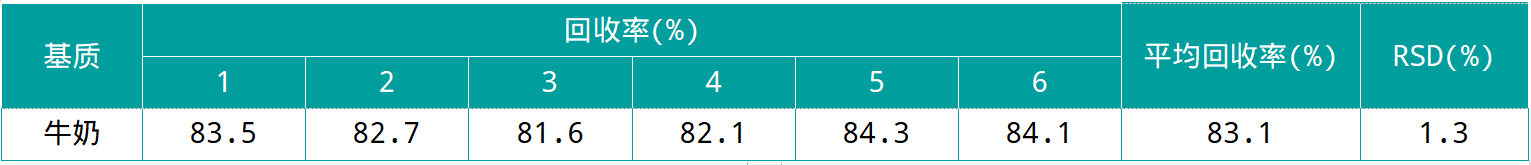 為了驗證該方法的回收率,本實驗取2g牛奶樣品,加入五氯酚標準品進行加標回收驗證(n=6),添加水平為1ug/kg。同時制備5份經提取、凈化和濃縮的空白試樣,加入適量標準品,配制成濃度為0.5μg/L、1.0μg/L、1.5μg/L、2.0μg/L、5.0μg/L的基質校正曲線進行定量。實驗數據如表-2所示。加標回收率在81.6%-84.3%之間,RSD值控制在5%以內。說明該方案能夠很好地運用于牛奶中五氯酚殘留量的測定。