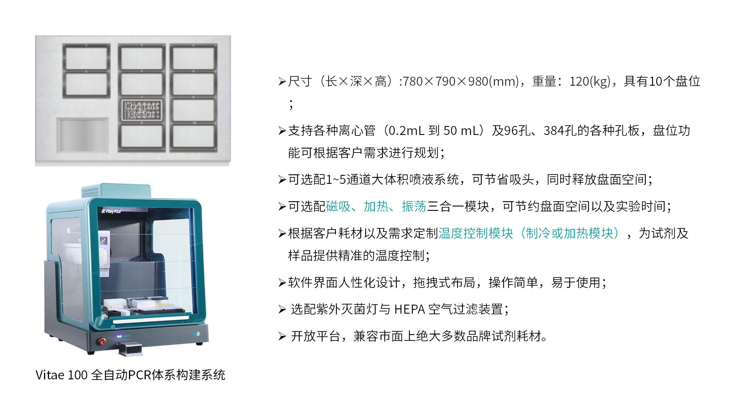 Vitae 100全自動PCR體系構建系統(tǒng)可高效快速完成各種PCR反應的體系構建,移液精確,減少人工干預帶來的誤差,保證結果重復性和穩(wěn)定性。也可選配加熱、振蕩、磁吸三合一模塊,完成基于磁珠分離技術的核酸制備,將核酸提取、產(chǎn)物收集和PCR體系配置全流程集成一站式自動化操作。