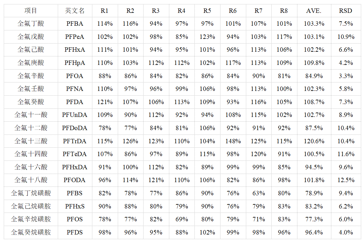 為了驗證該方法的回收率,本實驗向?qū)嶋H樣品(1000 mL)加入全氟類化合物標準品進行加標回收驗證(n=8),加標濃度水平為20ng/l,如表所示,加標回收率為77.3%-120.6%,相對標準偏差(RSD):3.3%-12.5%。