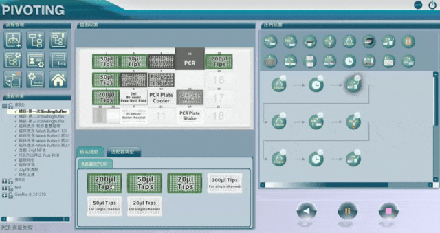 軟件界面功能劃分清晰,拖拽式圖標,編程簡單易操作,可輕松適配不同品牌建庫試劑流程,儲存經驗證的各類試劑盒程序,一鍵式啟動新實驗。