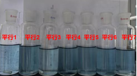 選擇GSB 07-3163-2014 200748水質 總硬度質控樣進行測試。質控樣真值為2.81±0.08mmol/L (2.73-2.89)。測定結果及滴定最終顏色見下圖。