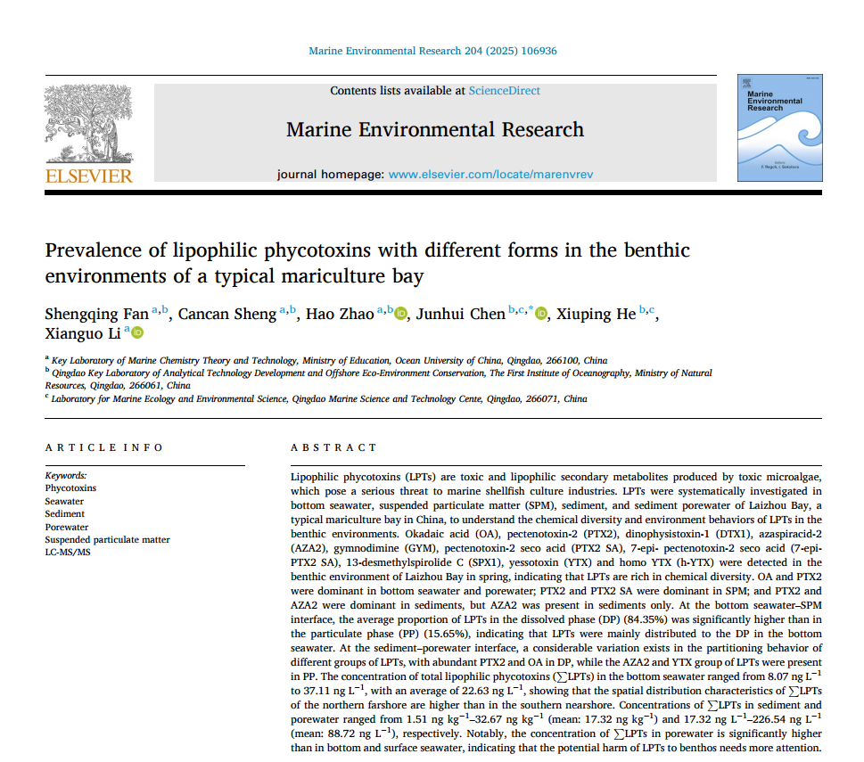 親脂性藻毒素(LPTs)是由有毒海洋微藻產生的有毒親脂性次級代謝產物,對海洋貝類養殖業構成嚴重威脅。本研究系統調查了中國典型養殖海灣 —— 萊州灣的底層海水、懸浮顆粒物(SPM)、沉積物和沉積物間隙水中 LPTs 的化學多樣性和界面行為。