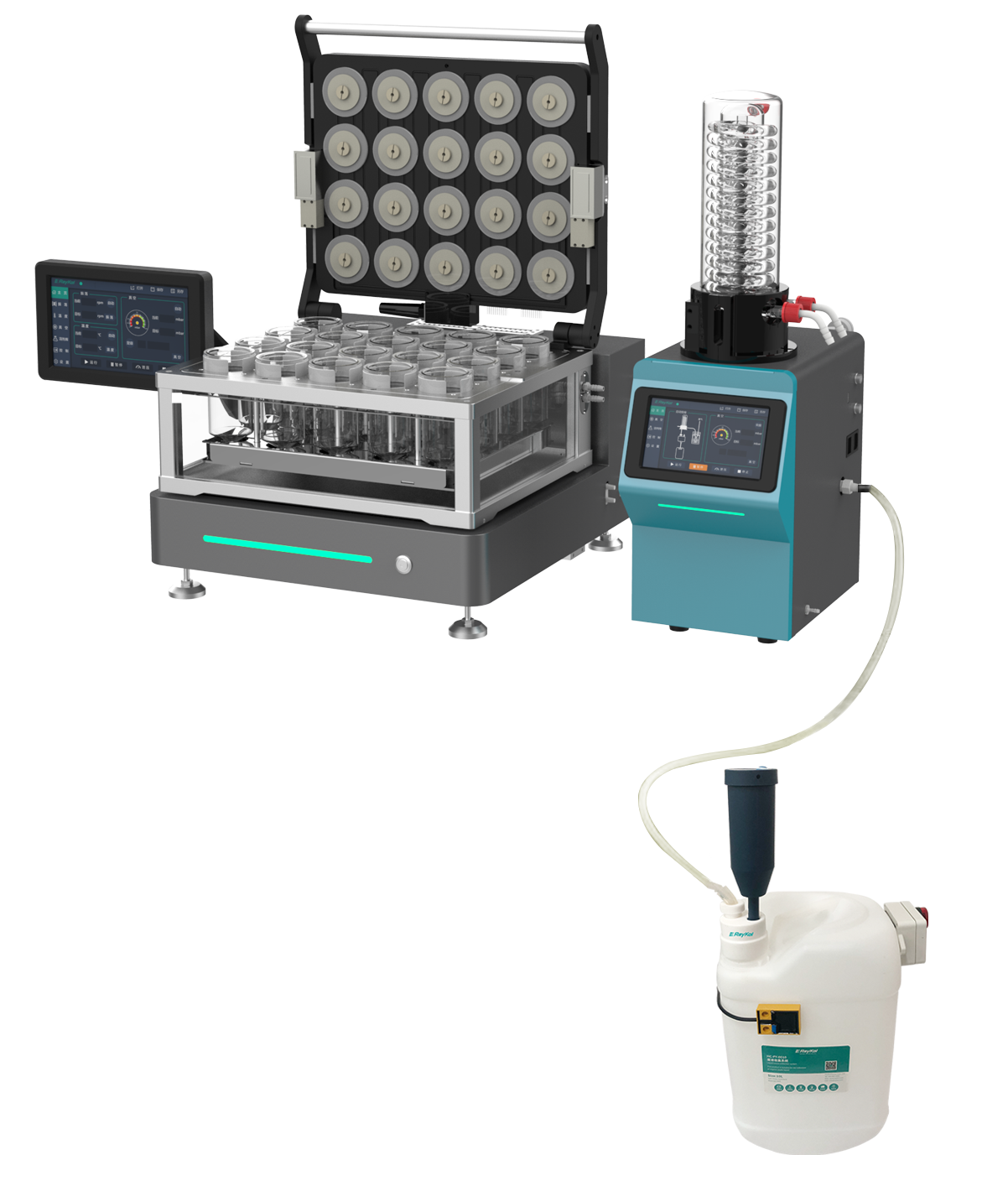 針對上述減壓濃縮冷凝排放的弊端,睿科推出了一款智能溶劑冷凝回收控制系統,其可實現大批量沸蒸氣的連續冷凝。整個過程無需中斷實驗,當冷凝廢液在緩沖瓶中逐漸增加至高位,系統將自動實現廢液常壓排放至廢液桶中。多次重復上述動作,可實現以下功能: